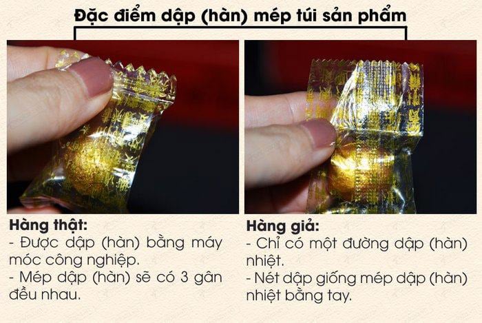 Khi sản xuất, các túi nilon bọc viên An Cung Ngưu Hoàng được đóng gói bằng cách hàn kín mép. Các sản phẩm chính hãng thường có độ dày và độ chắc chắn của vết dập hàn mép túi nilon đều và tạo ra đường hàn rõ ràng và sạch sẽ. Trong khi đó, hàng giả thường có vết dập hàn mép túi nilon bị lỏng lẻo, không đồng đều và có vết hàn không rõ ràng.