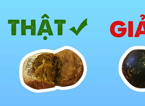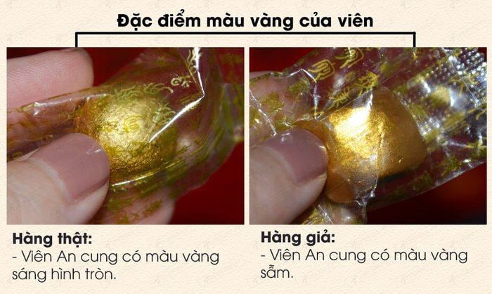 Màu sắc bên ngoài: Viên an cung ngưu thật có màu vàng sáng hình tròn, viên giả sẽ có màu vàng sẫm hơn.
