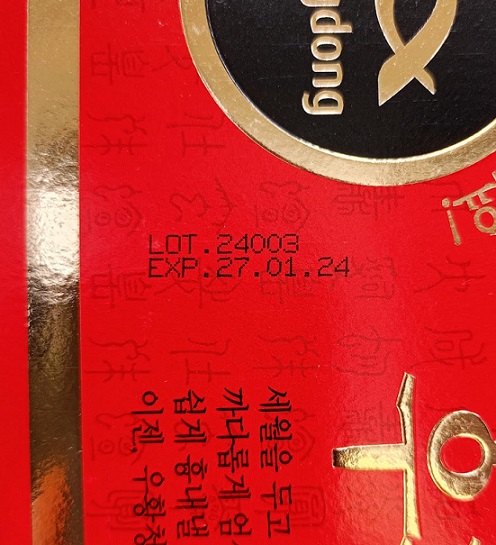 an cung ngưu hoàng Hàn Quốc kwangdong chính hãng có số lô, hạn sử dụng in rõ nét. 2 chữ số đầu tiên là năm sản xuất (24 là năm 2024), số lô sản xuất của năm, các chữ số tiếp theo là số thứ tự của hộp thuốc trong lô đấy.