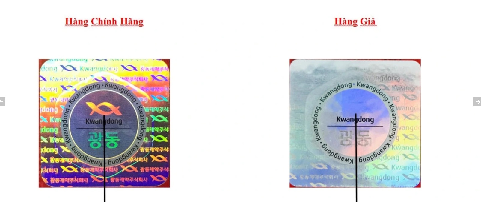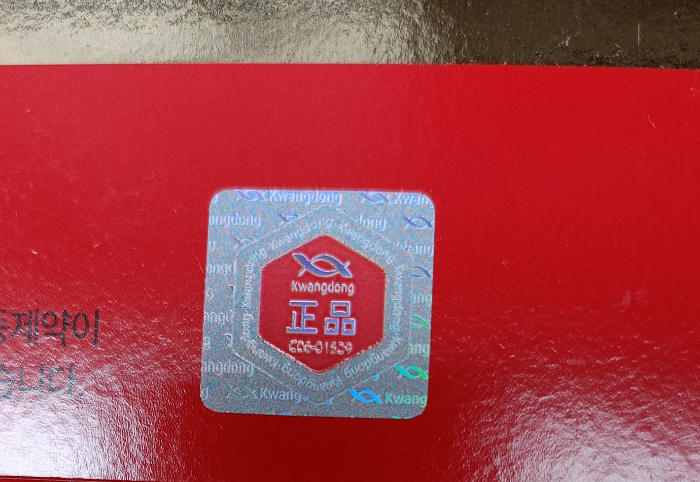 - 3 : an cung ngưu hoàng Hàn Quốc kwangdong chính hãng có tem 7 màu Hologram rất sắc nét. Trên tem có logo và tên Tập đoàn Kwangdong được in chìm và bóng. Khi chụp thẳng vào tem thật thì xuất hiện logo hình rõ nét.