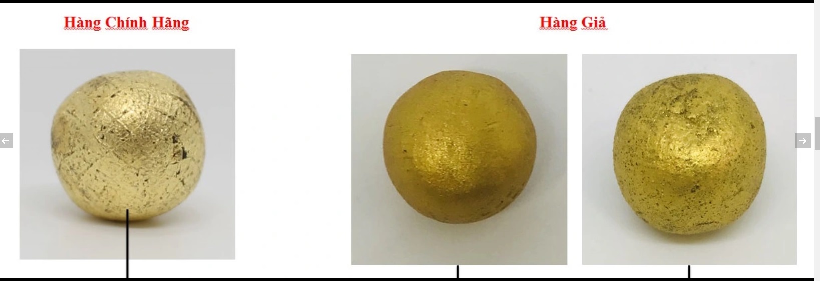 --- Viên hoàn hàng thật tròn đều, có gân lưới. Viên hoàn được bọc bằng lá vàng dùng trong ngành dược phẩm, có màu vàng, sáng đẹp, khi cầm không bị dính ra tay