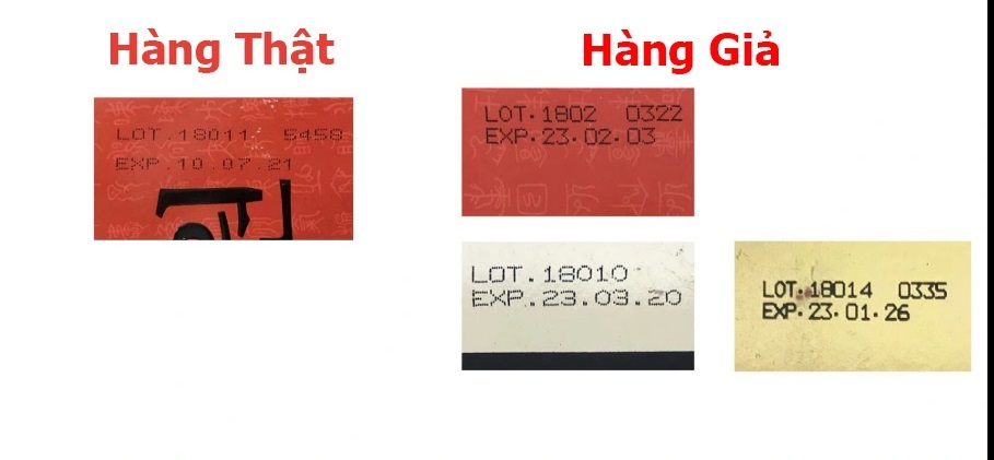 Với các sản phẩm làm giả, sẽ không có dấu hiệu trên mà thay vào đó là các mã E.C và H.C được in nhỏ, có màu trằng hoặc đen ở ngay phía dưới hạn sử dụng.